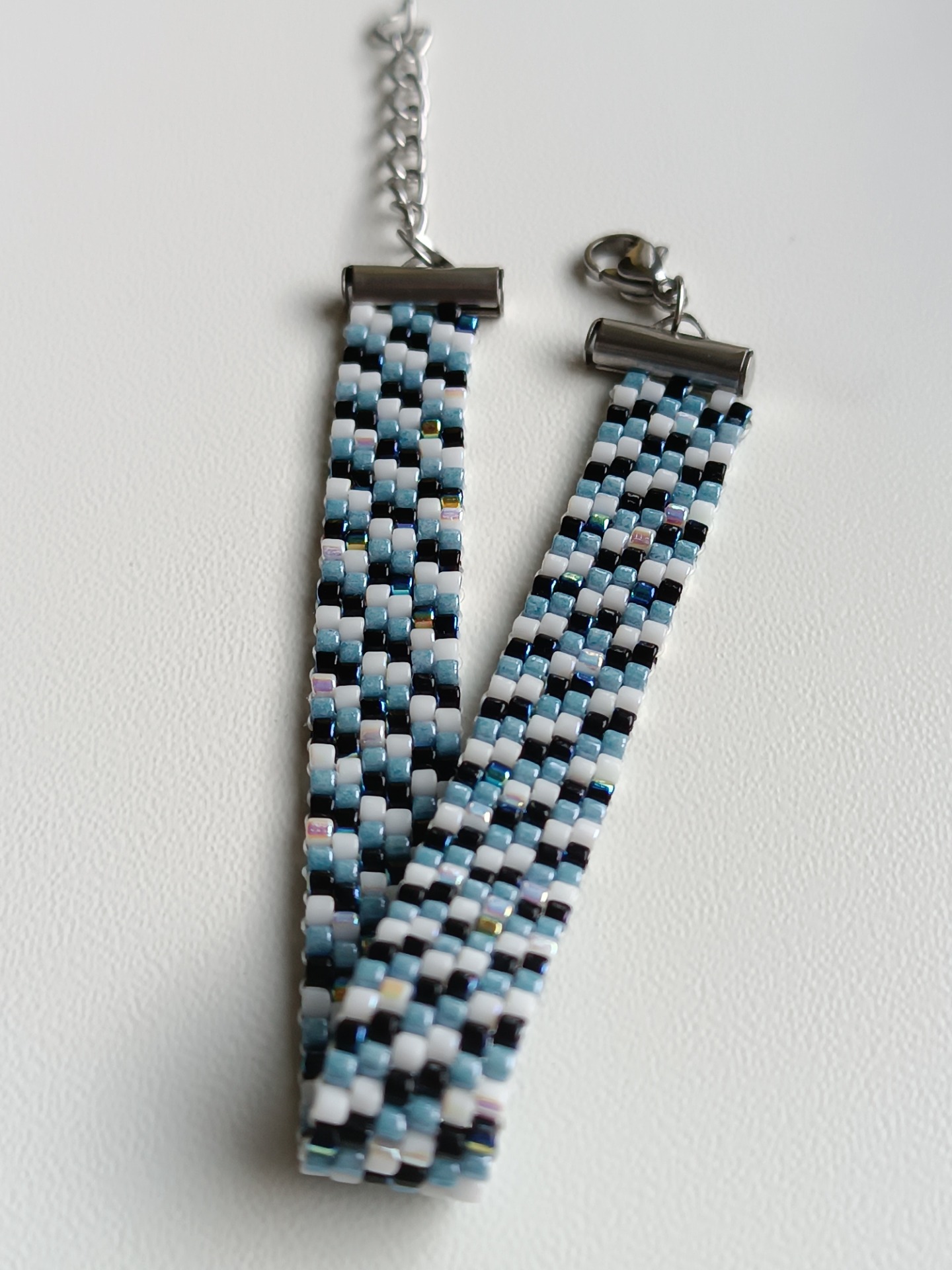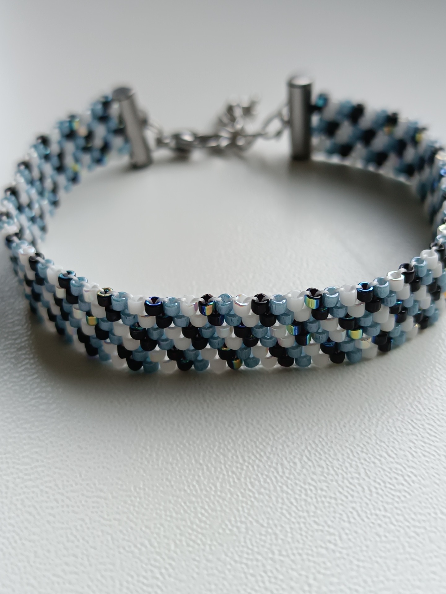 Dámský náramek šitý plochým peyote stehem ve třech barevných kombinacích.
