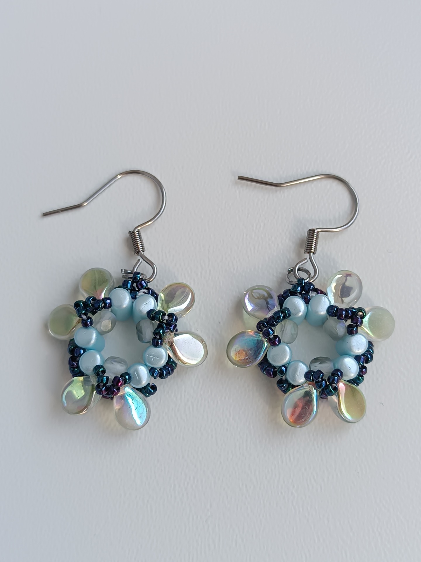 Materiál: korálky Pip, TOHO Round, Matubo Rulla, ohňovky broušené, afroháčky jsou z chirurgické oceli