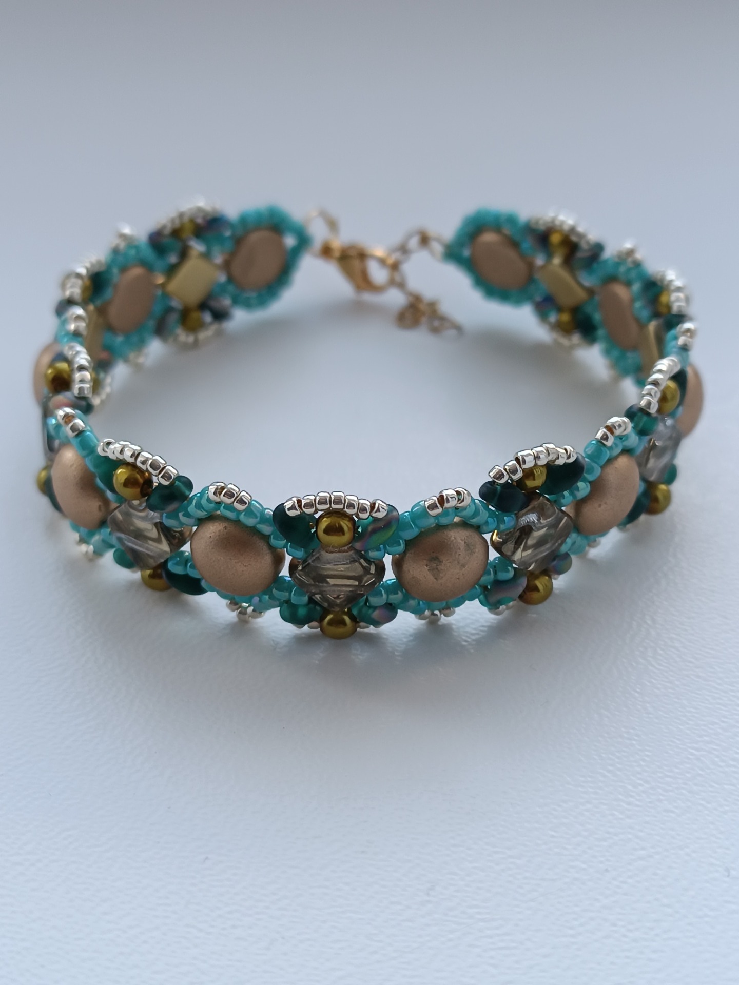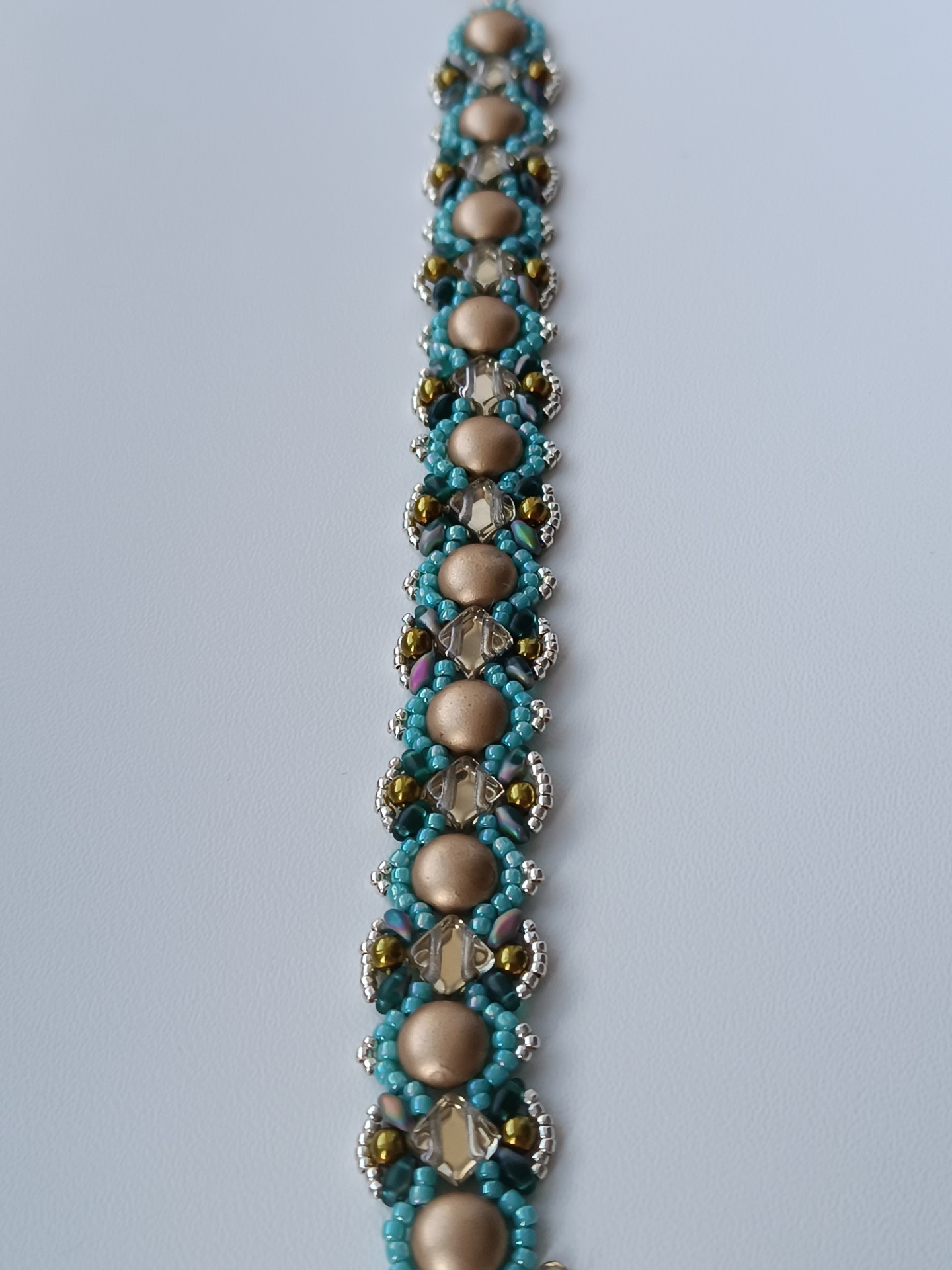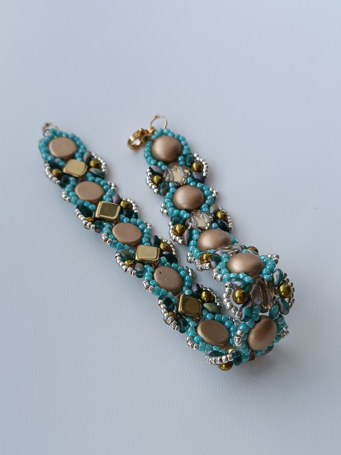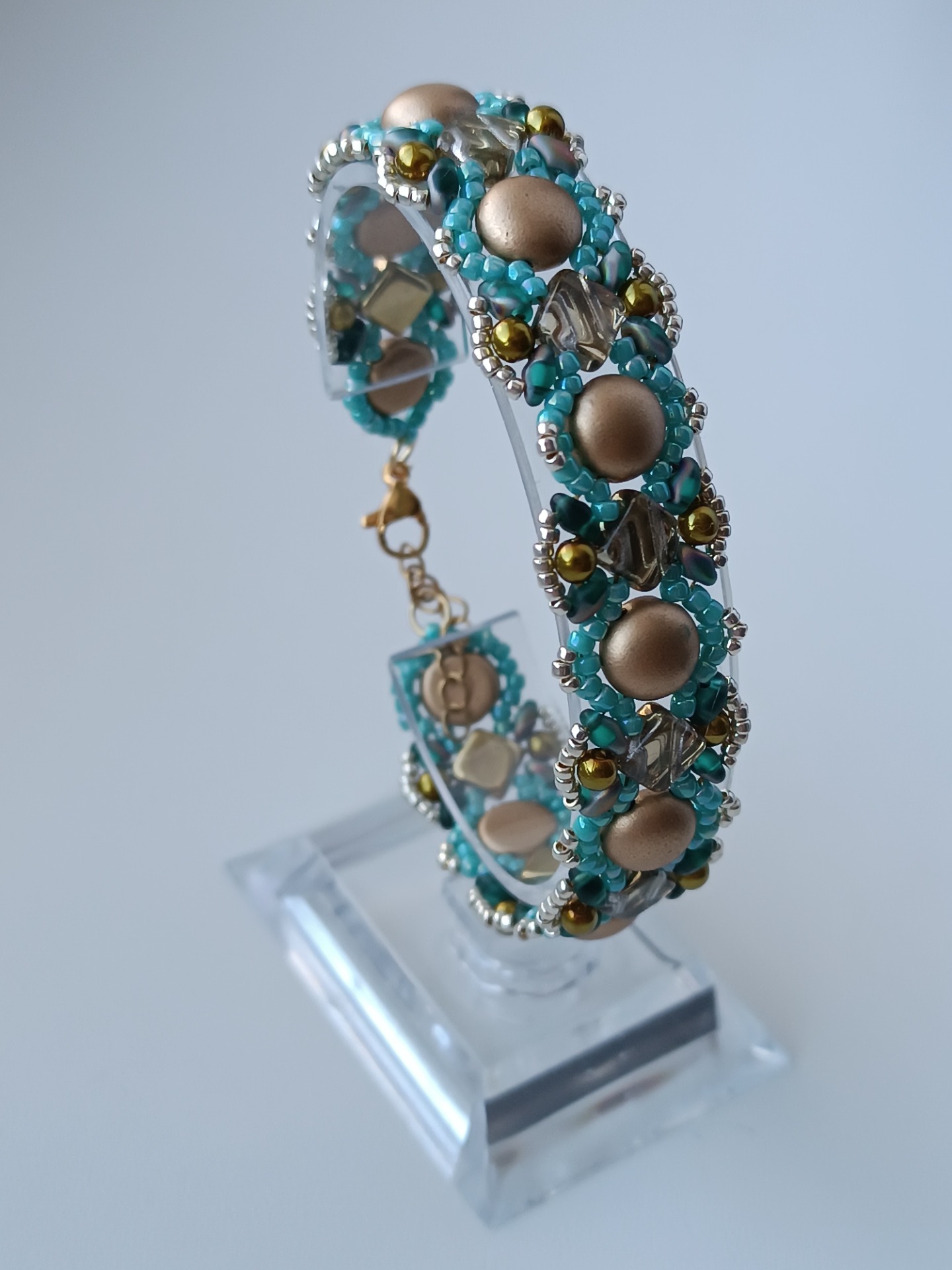 Ručně šitý náramek ze série Candy v osvěžující kombinaci tyrkysových a zlatavých tónů přináší jedinečné spojení elegance a zaměření na detail.
