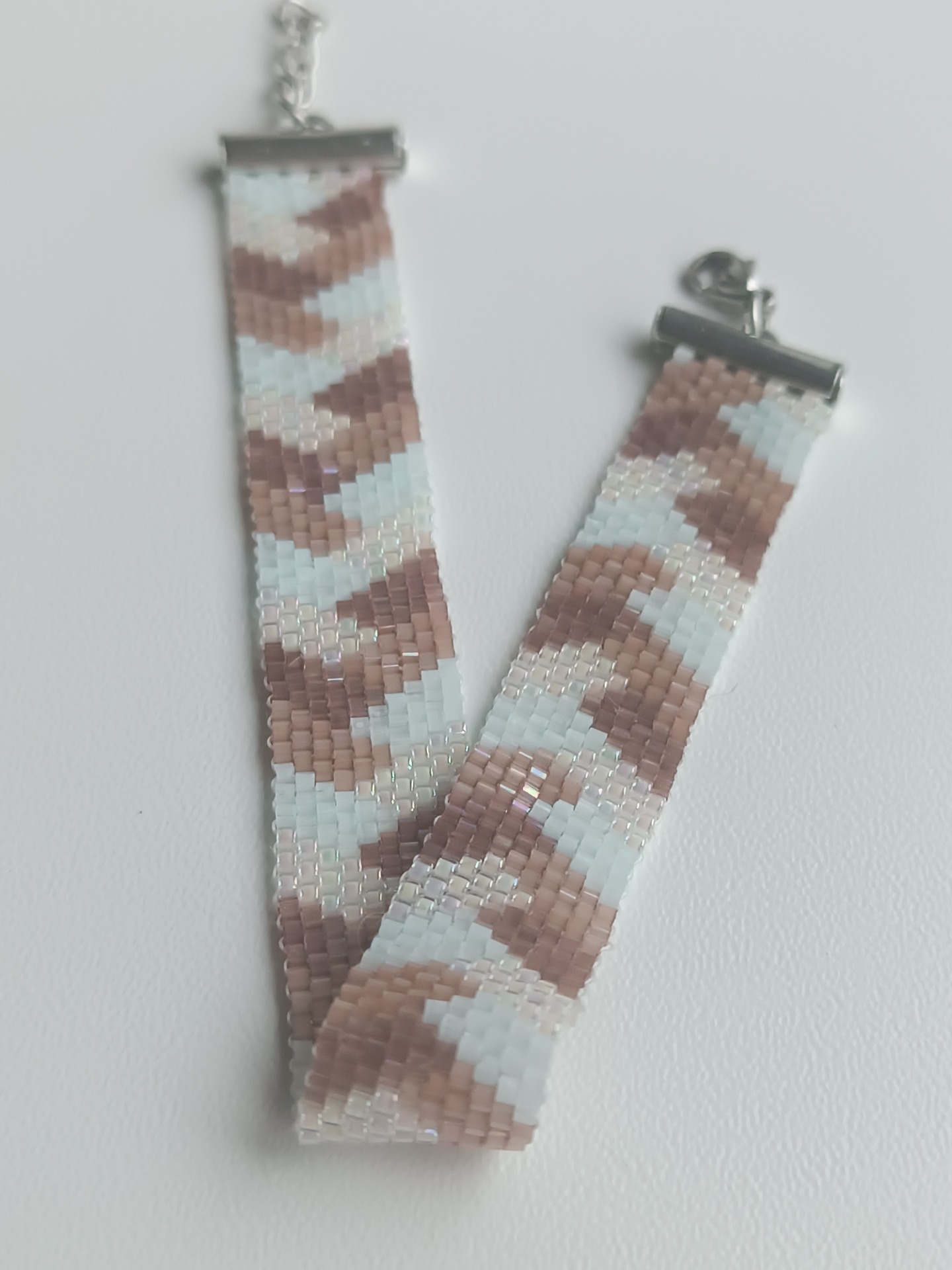 Elegantní dámský náramek šitý peyote stehem v kombinaci hnědých odstínů s přídavkem modré a bílé