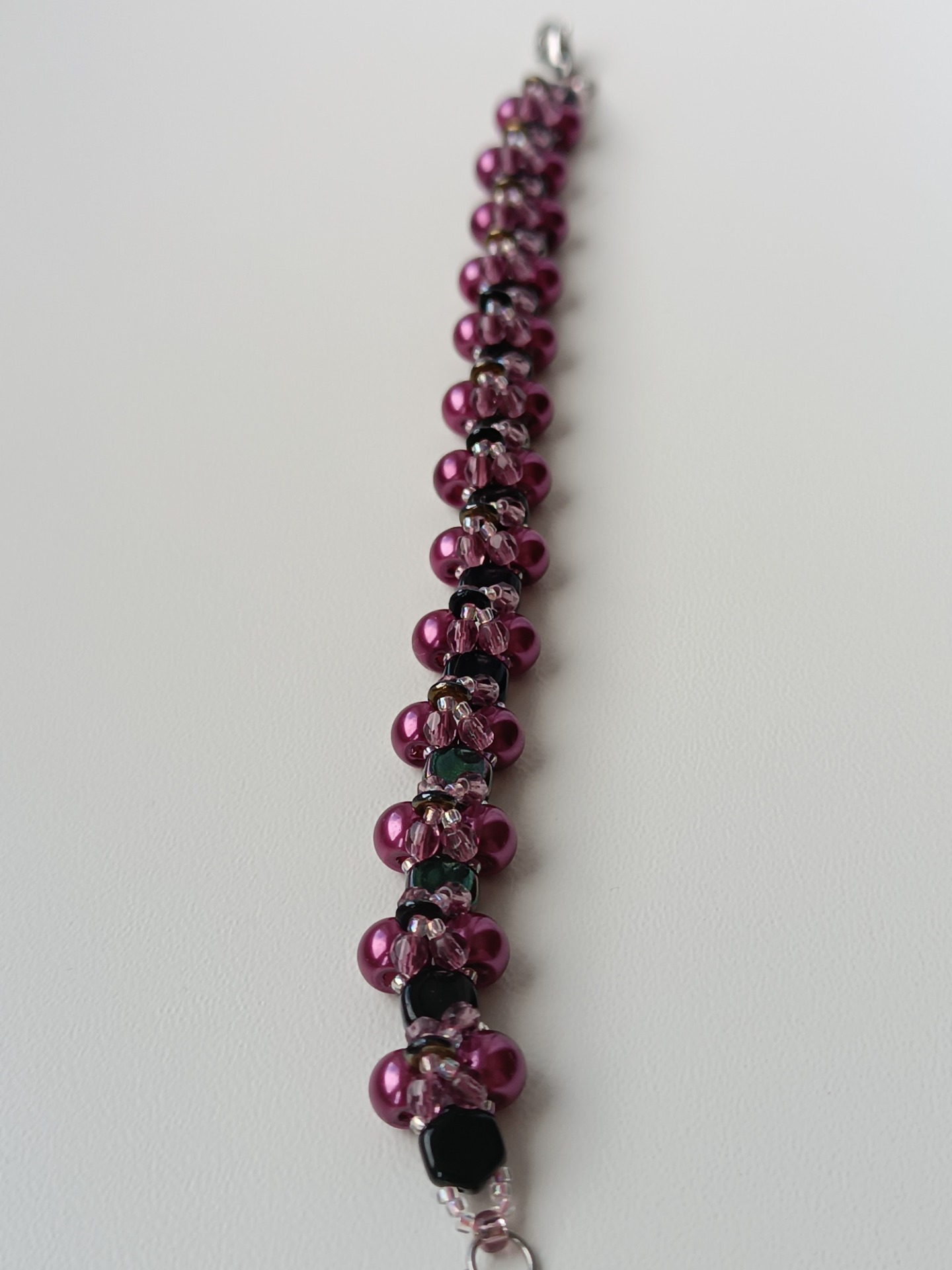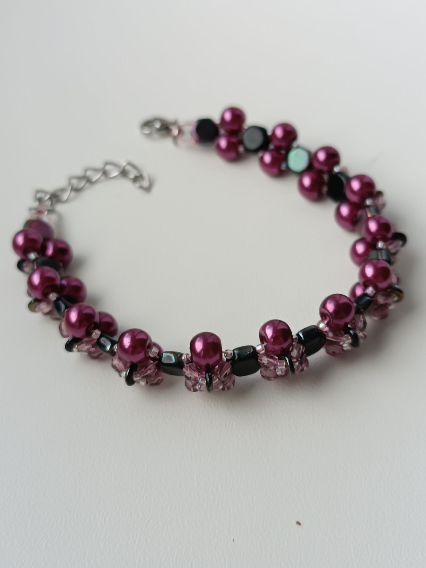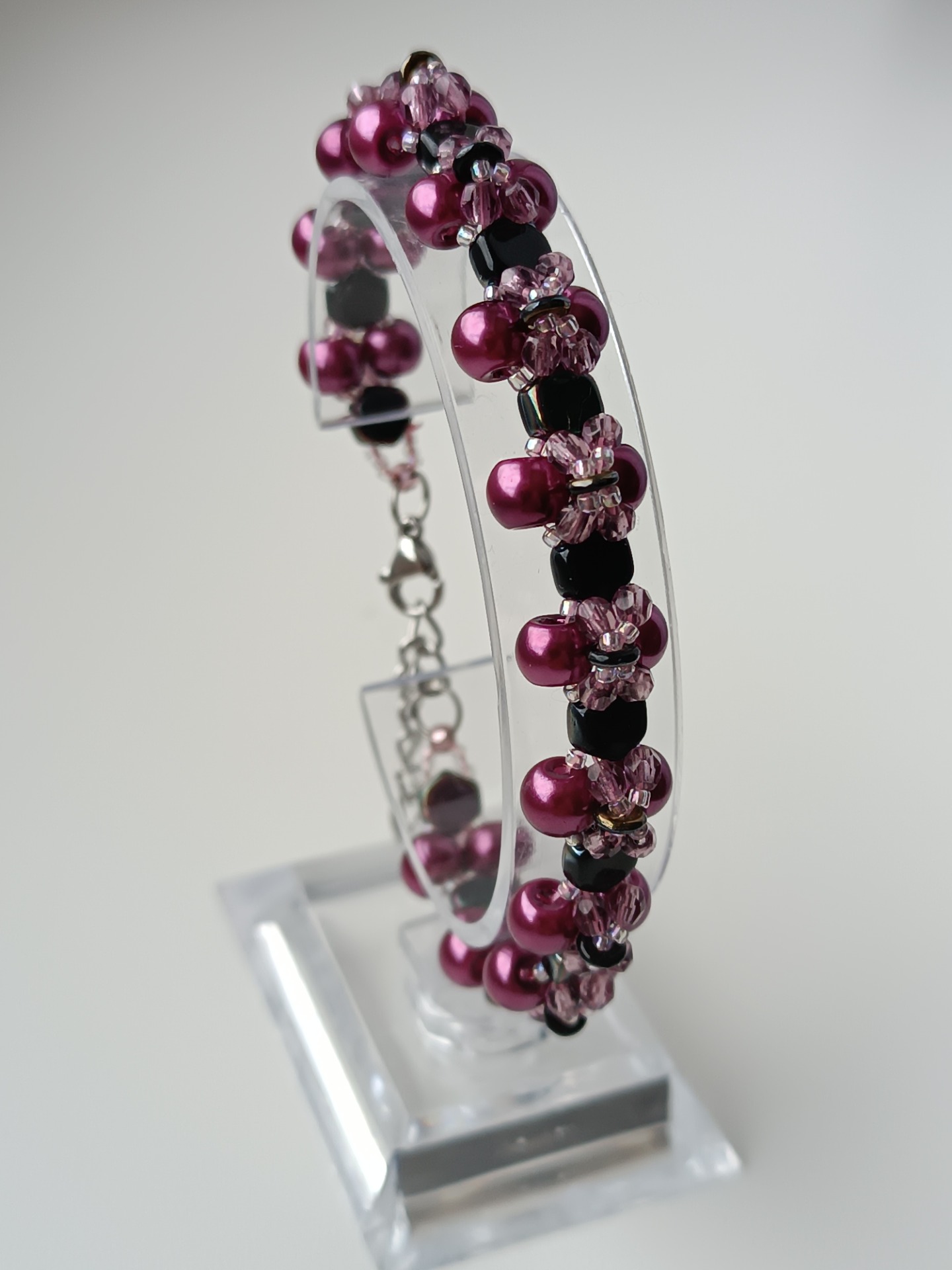 Jemný a přitom výrazný náramek v kombinaci malinové a černé. Díky třpytu broušených korálků krásně odráží světlo a dodá šmrnc každému outfitu.