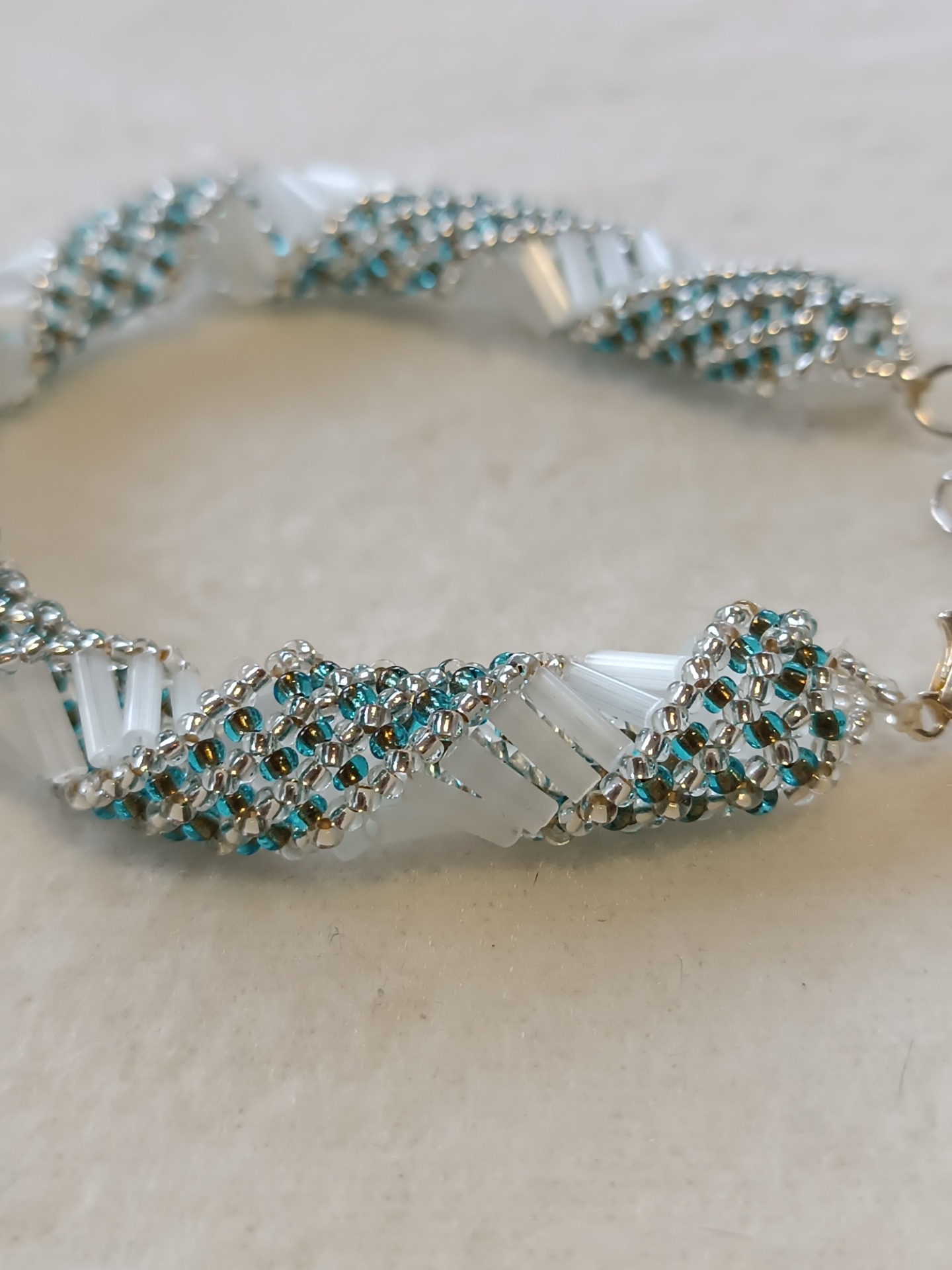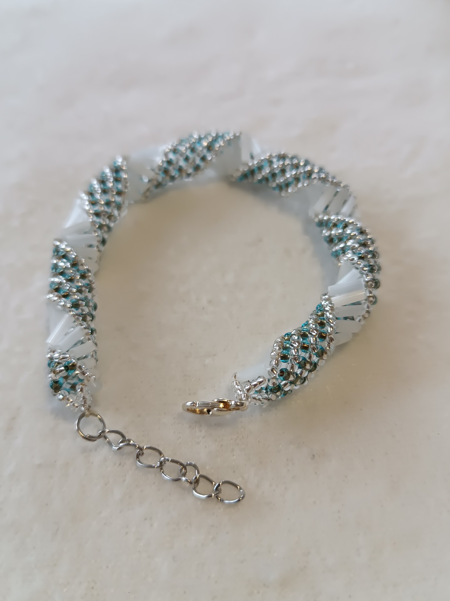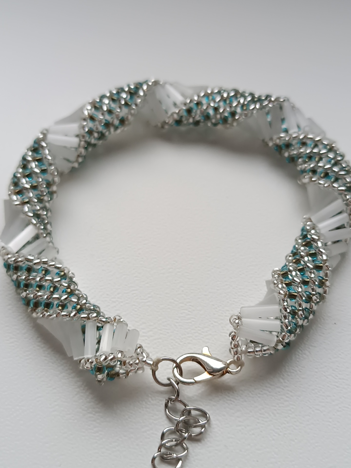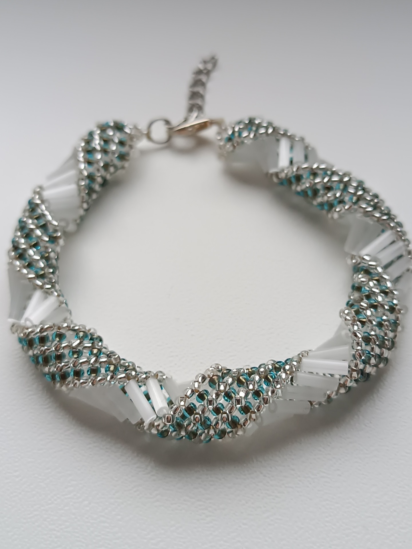 Materiál: TOHO korálky 11/0, preciosa rokajl 11/0, bílé tyčinky 6mm, zapínání je z bižuterních komponentů