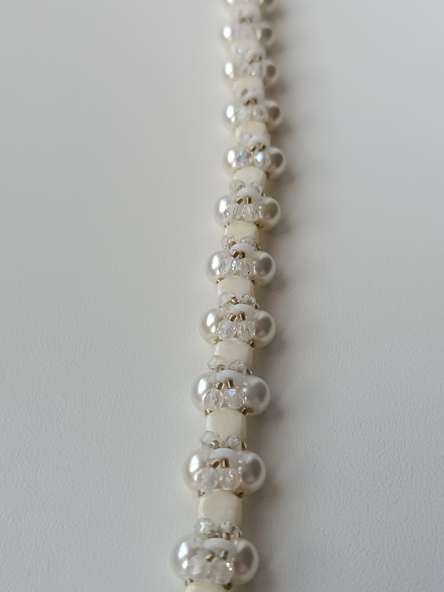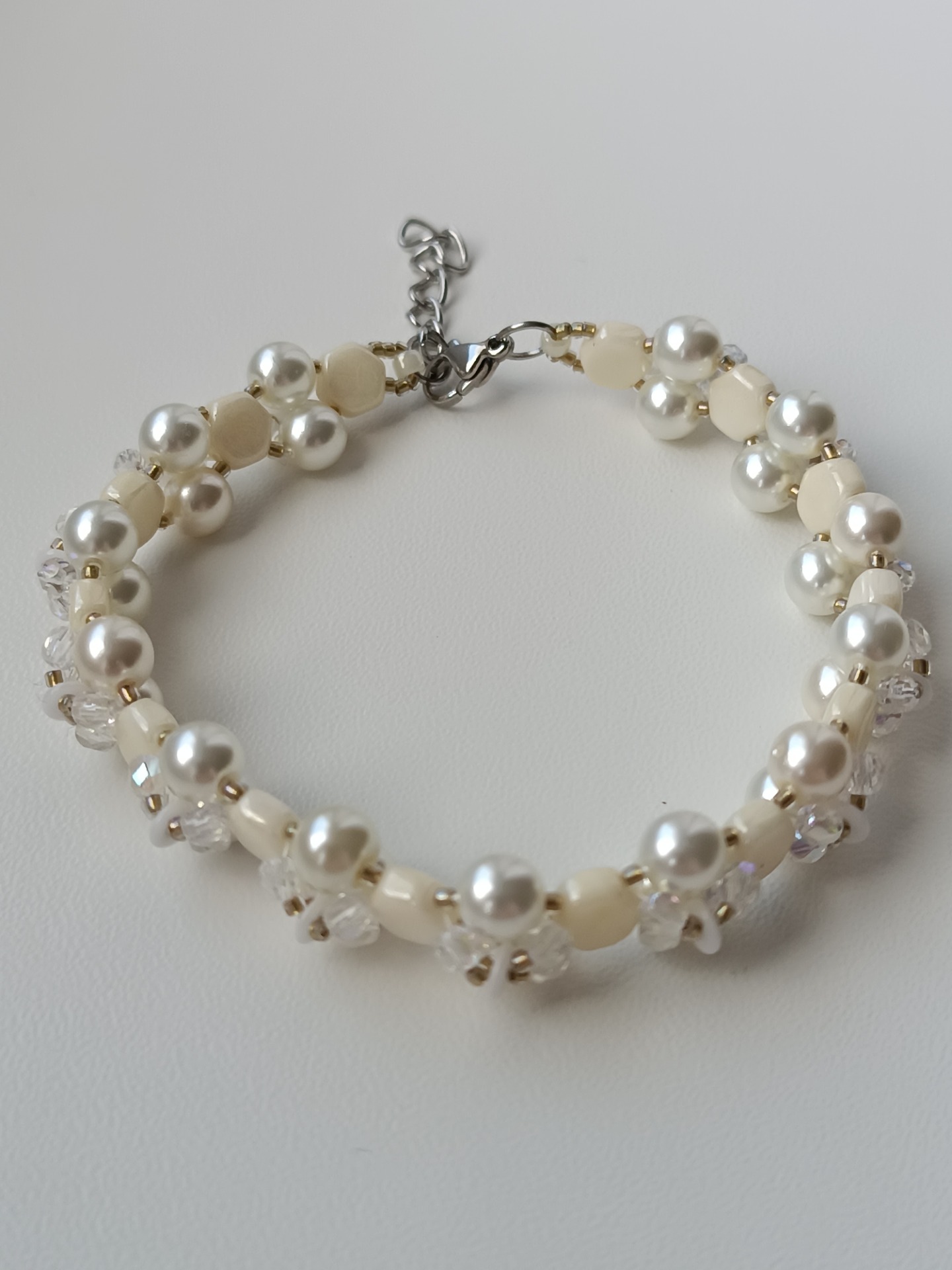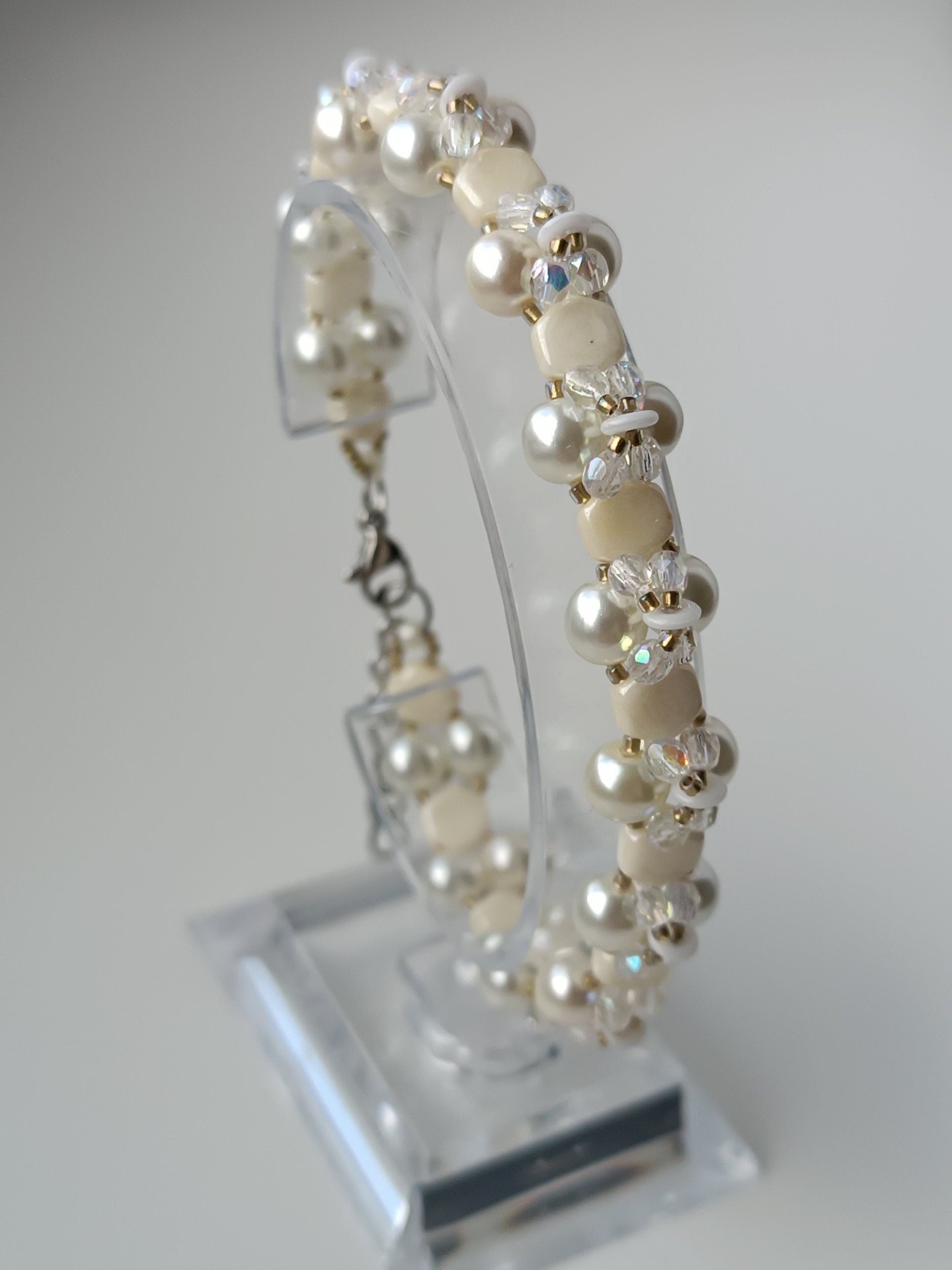Jemný a decentní dámský náramek ve světlých odstínech. Díky broušeným korálkům dodá třpyt a eleganci šperku.