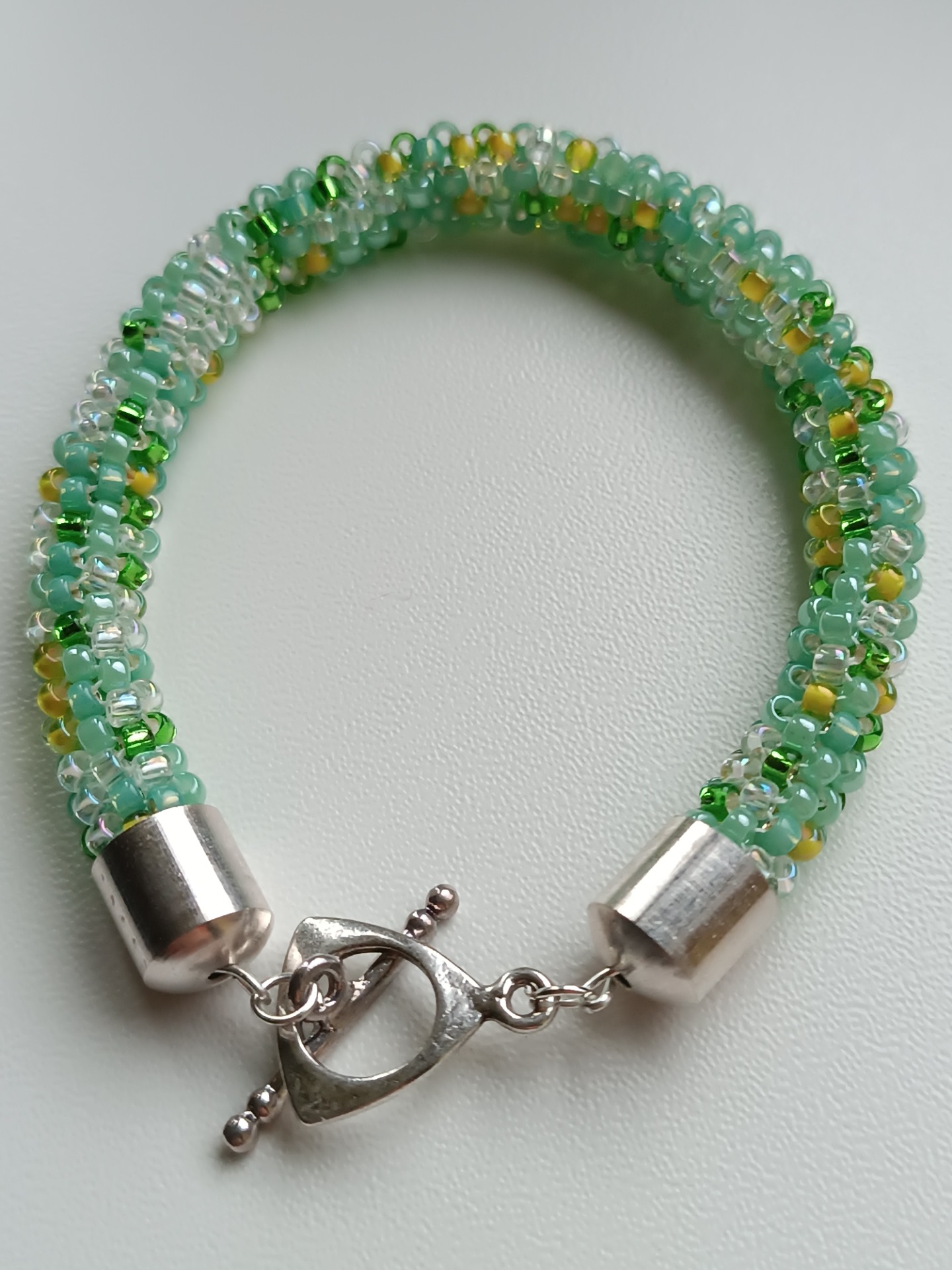 Dámský náramek šitý peyote stehem ve tvaru spirály s praktickým americkým zapínáním.