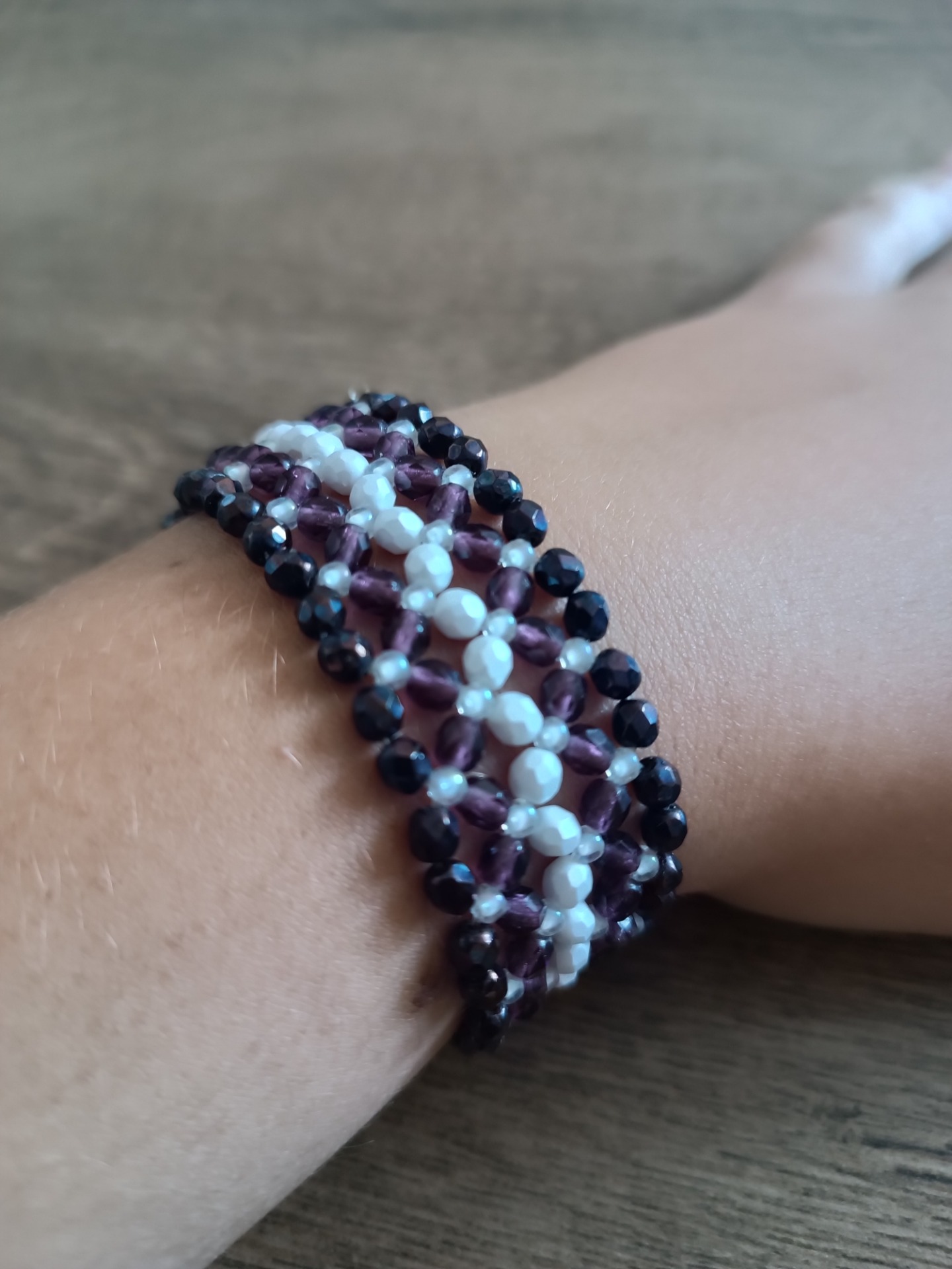 Dámský náramek šitý z broušených ohňovek na pružence.