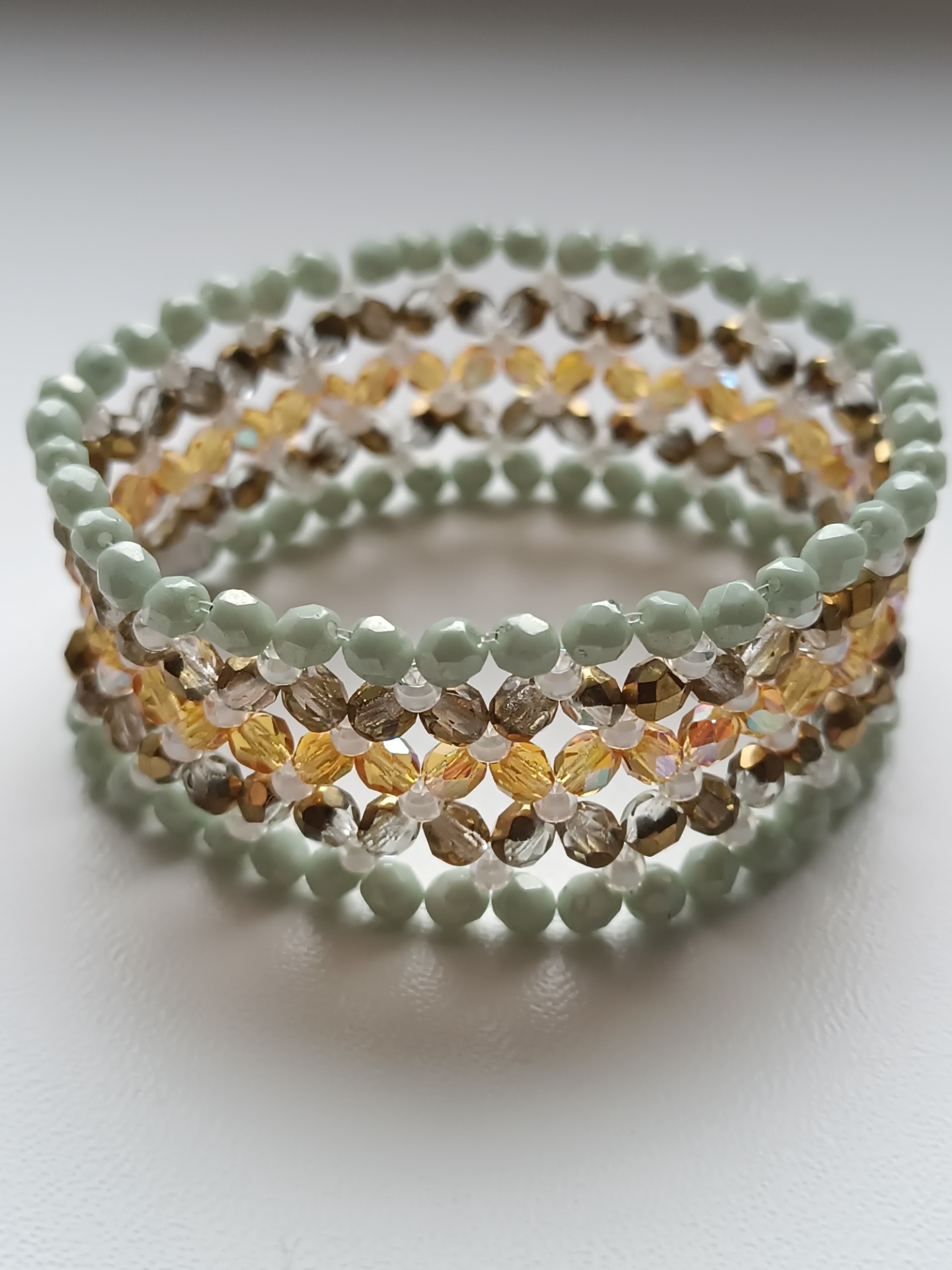 Dámský náramek navlékaný na pružence z broušených korálků.