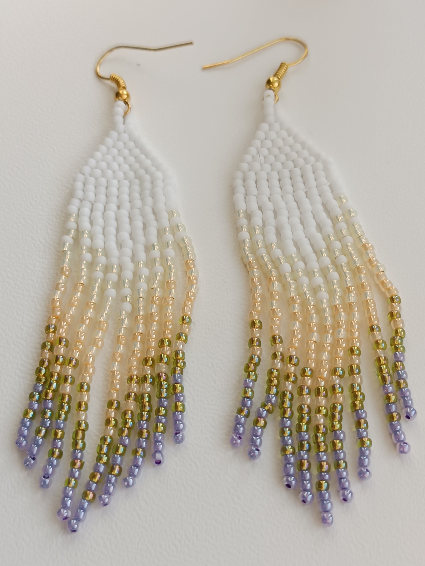 Sada náušnic a náramku. Náramek je šitý ve tvaru dutinky a náušnice jsou ve střapcovém stylu.