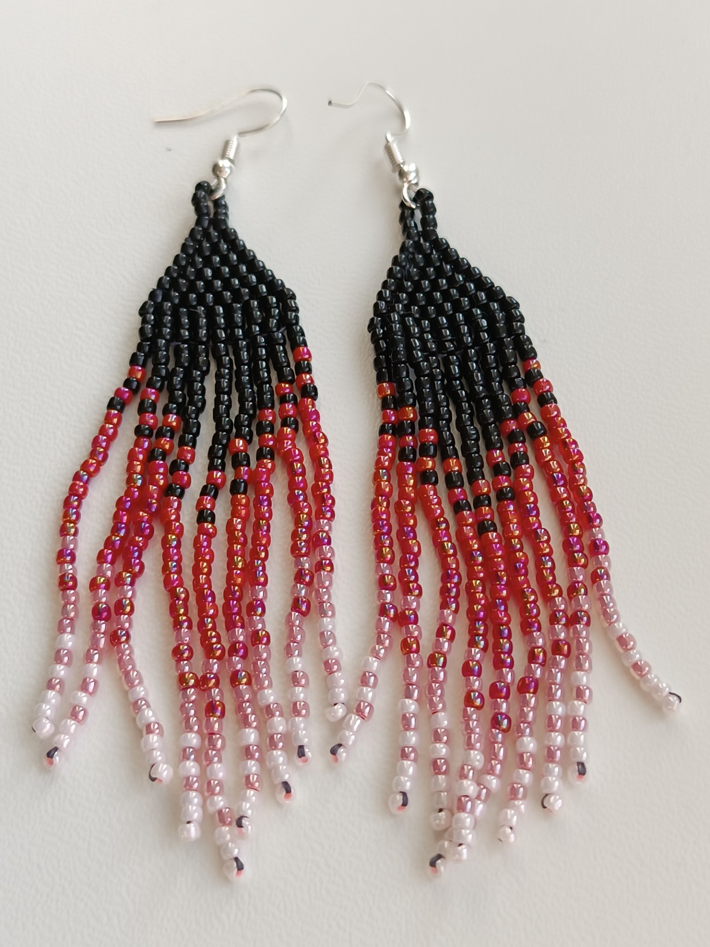 Sada šitých náušnic a náramku. Náramek je šitý ve tvaru dutinky a náušnice mají střapcový styl.