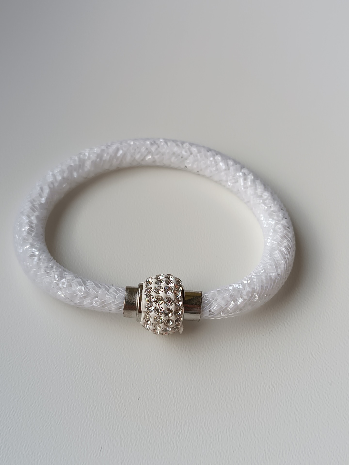 Materiál: bílá síťka, štěpky rokajlu 2mm, bílé magnetické zapínání s kamínky je z bižuterního komponentu